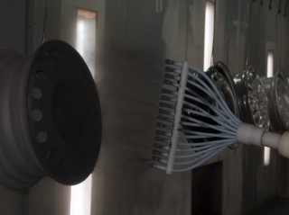 automatisch coaten,met een tribo coatings systeem, speciaal spuitunit in de kleur zwart,serie toepassing, met deze spuit Unit ,24 spuitmonden, heeft ook de binnen zijde een zeer goede kant dekking, allleen voor grote serie's kunnen wij dit systeem toepassen,
