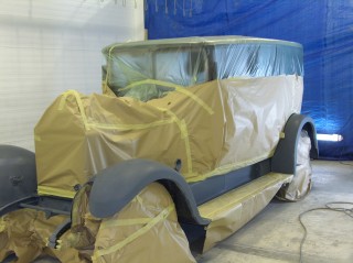 aangebrachte grijze spuit-bloklaag hiermee worden kleine oneffenheden gevuld , het moet van jan spiegeltjes glad worden, alle kleine oneffen heden worden hier door verwijderd.