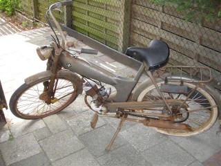 DMF bromfiets, 1953, zo is hij bij ons binnen gekomen, de velgen waren met een schot hagel bewerkt, vraag niet hoe lang dit projekt geduurt heeft, , wel de 1e prijs gekregen bij het N.V.T in woerden sept 2014, Jan gaat nu even heel lang op vakantie, heeft even geen tijd meer voor deze pronk stukken.