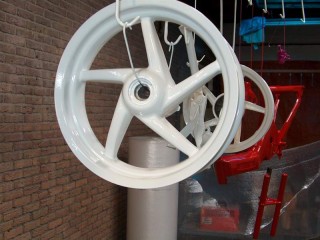 Dan brengen wij een coatingslaag aan en moffelen op ca. 180° C. Gebruikt aluminium, zoals velgen en carterdelen, stralen wij aan met een speciaal aangepast straalmiddel of wij doen glasparel stralen voor een perfekt uiterlijk. Uiteraard behandelen wij ook messing delen (zie de foto's).